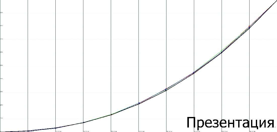Гамма-кривые режима Презентация очень близки к идеальным, и, казалось бы, с цветопередачей все должно быть хорошо, но мы уже знаем, что в этом режиме — из-за большого разброса точек клина серого от референсной кривой — всплывает зеленый оттенок. А вот точность передачи полутонов (без учета цветности) в этом режиме реально на высоте.
