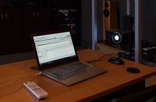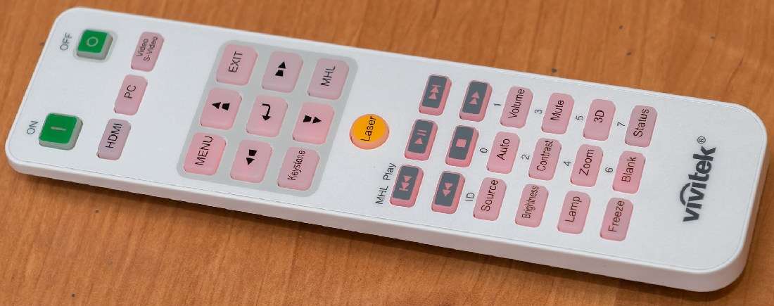 Второе — вместо традиционной кнопки Input, имеется 3 кнопки управления входами. Это лишает нас тупой необходимости тыкать на одну кнопку в поисках нужного входа. В общем, приятное инженерная фишка. И совсем меня раздобрила лазерная указка, встроенная в пульт ДУ: лазерная точка одним своим появлением заметно расширяет список профессий нового проектора Vivitek, делая его и мастером презентаций, и мудрым источником знаний, и просто умным помощником школьного учителя.