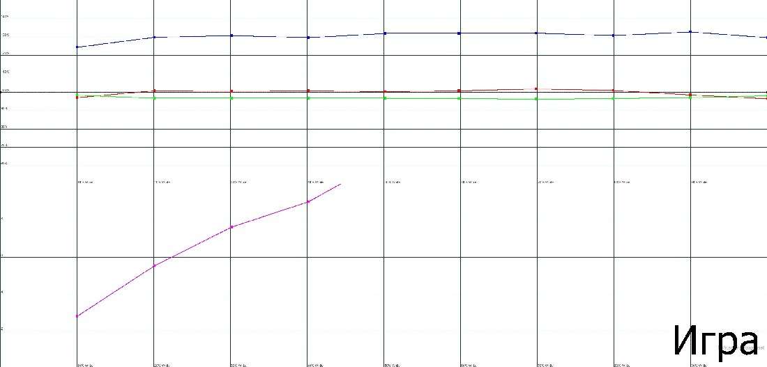 Наибольшее расслоение наблюдается в режиме Игра. В светлых участках изображения кривая красного канала проходит выше уровня референса, а кривая зеленого канала — ниже. Такое расположение кривых и определяет холодную цветовую температуру режима Игра. Главный вопрос — повлияет ли такое расслоение гамма-кривых на точность калибровки градаций серого, от которых во многом зависит видимость паразитных оттенков.