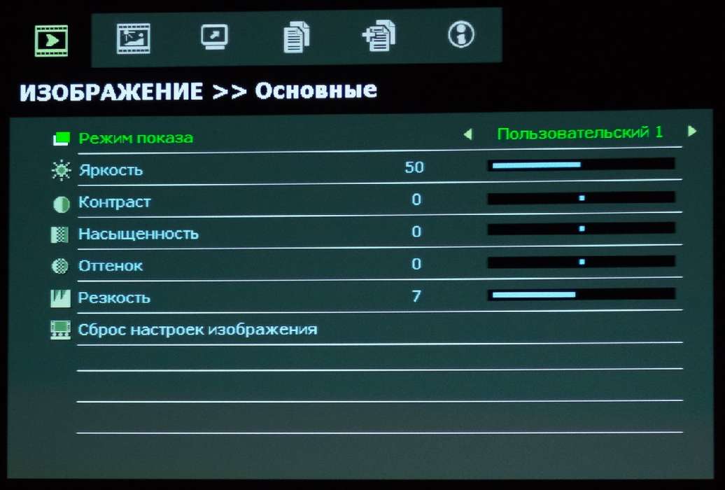 В Основных настройках предлагается выбрать режим работы, яркость, контраст и прочие базовые параметры изображения. Все стандартно и интуитивно привычно.