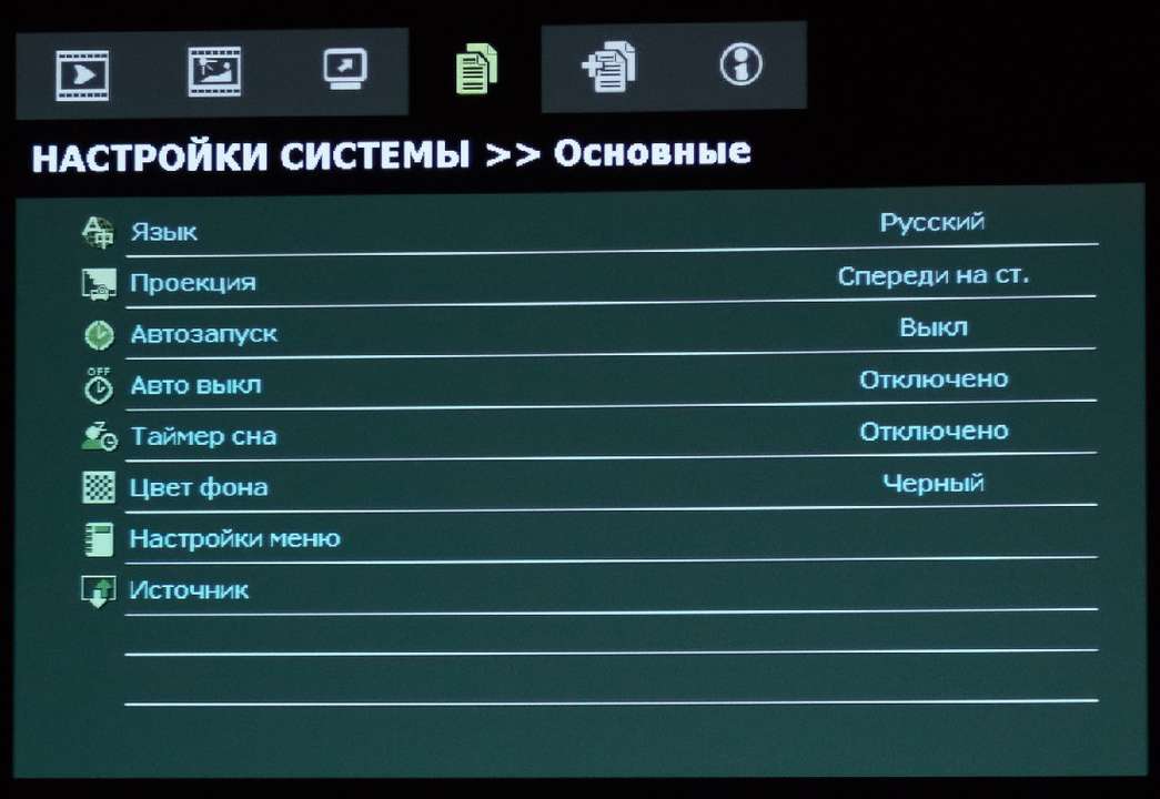 В настройках системы все стандартно: таймеры сна, язык, тип проекции и прочее. Мне понравилось, что можно проецировать меню не по центру экрана, а в любом углу. Такой нехитрый фокус полностью открывает изображение для калибровки и значительно ее облегчает.