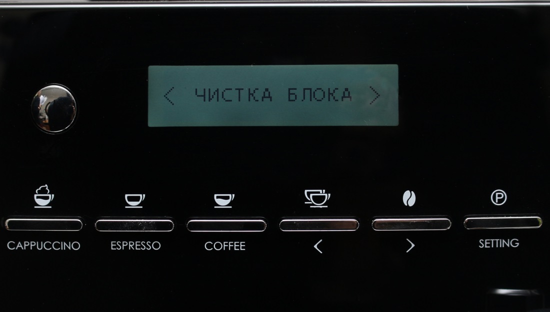 О необходимости очистки машины от кофейных масел напоминает сообщение "ЧИСТКА КОФЕЙНОГО БЛОКА". Сама очистка занимает 10 минут.