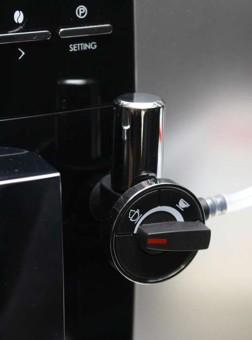 Конструкция простая и надежная. Трубка легко вставляется в отверстие капучинатора. Сам он небольшой, четко маркированный: левое положение переключателя — готовится пенка, правое — горячее молоко.
