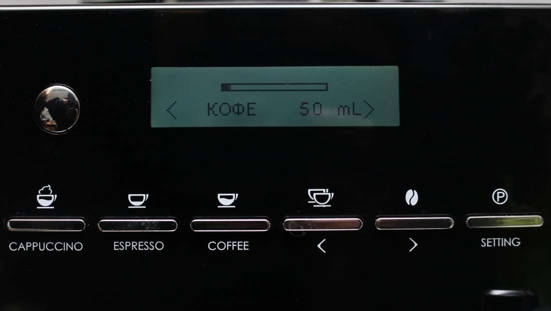 При приготовлении этого напитка проверяем возможность изменения установок. Во время помола меняем крепость напитка, нажав на кнопку с изображением зернышка. Во время подачи напитка меняем количество. Для увеличения объема нужно нажать на кнопку с изображением зернышка, для уменьшения — на кнопку с двумя чашками.