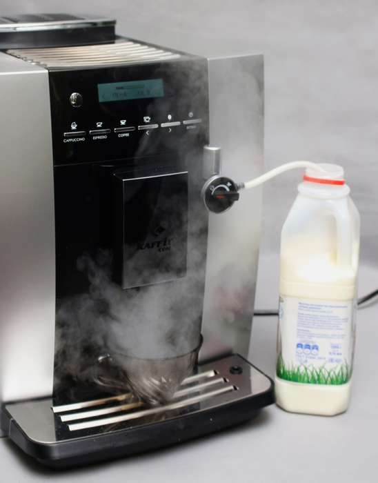 Для приготовления напитков с молоком или молочной пеной надо просто подключить к капучинатору входящую в комплект трубочку, а другой ее конец опустить в емкость с молоком — например, прямо в бутылку. Кроме того, при помощи переключателя на капучинаторе надо установить положение «молочная пена» или «горячее молоко». Для приготовления капучино берем чашку большего объема: 200 мл. Нажимаем кнопку «капучино», и через минуту получаем прекрасный напиток с нежной, но устойчивой молочной пенкой.