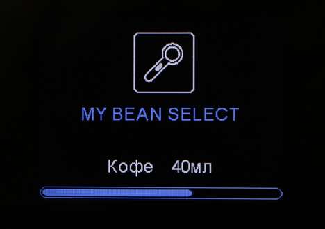 Процесс приготовления кофе начался, и мы видим, как наполняется чашечка, а дисплеей мигает и напоминает о выбранной функции My Bean Select и шкалу наполнения.