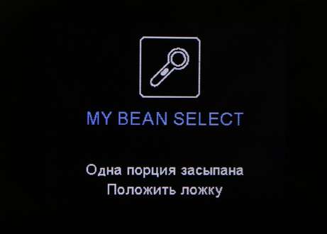 Засыпаем зёрна, дисплей напоминает нам о том, что порция засыпана и мерной ложечкой необходимо закрыть шахту.