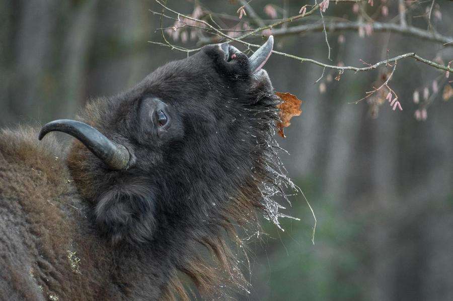 Кадр кормящегося в лесу зубра состоит в основном из темных оттенков, только сухой лист служит ярким пятном. Имея опыт съемки зубров при пасмурном освещении, я предполагаю, что экспонометрический замер камеры будет осветлять изображение и ошибется. Стоит учесть ошибки прежних встреч, установить высокую чувствительность 4000 ISO и ввести минусовую коррекцию. Звук срабатывания затвора во время серии у камеры D750 тихий, он не волнует увлеченного питанием зверя и удается подсмотреть, как тяжелый лесной житель нежно срывает тонкие веточки.