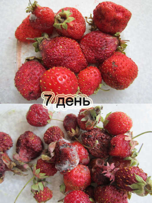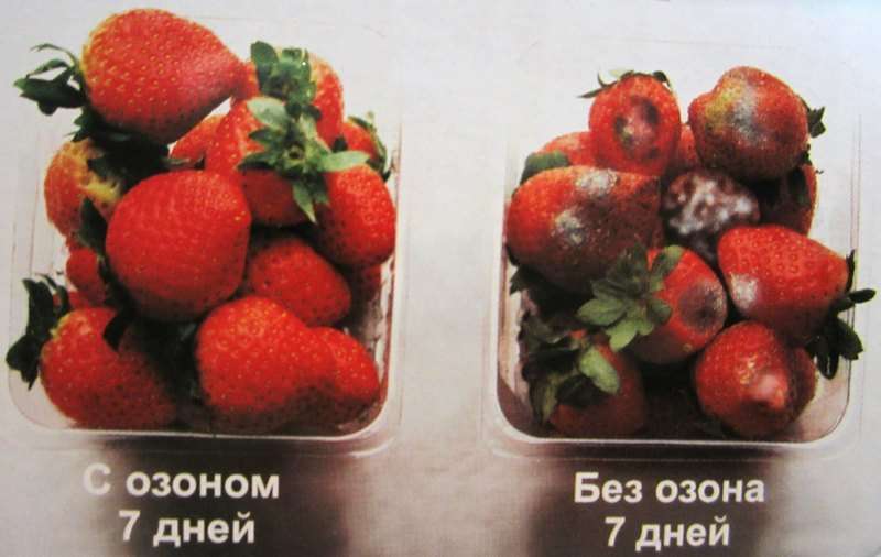 Так что же обнаружилось при нашем независимом исследовании? На ягоде, которая находилась в холодильнике без озона, уже на 4 день появились следы плесени. С озонатором же никаких изменений в ягоде не произошло.