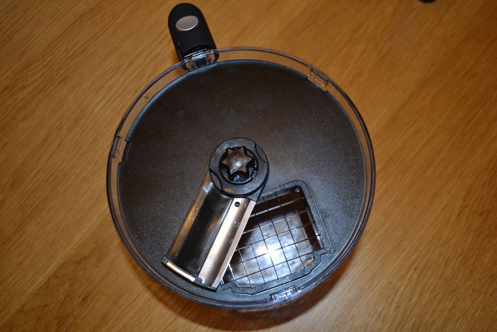 На мой взгляд, у него две функции: первая – это, конечно, безопасность. Толкатель позволяет легко вынимать насадку для нарезки кубиками, вам вообще не придется к ней прикасаться. Вторая функция, весьма полезная, – насадка позволяет последним кубикам быстро переместиться в чашу, а не остаться в прорезях.