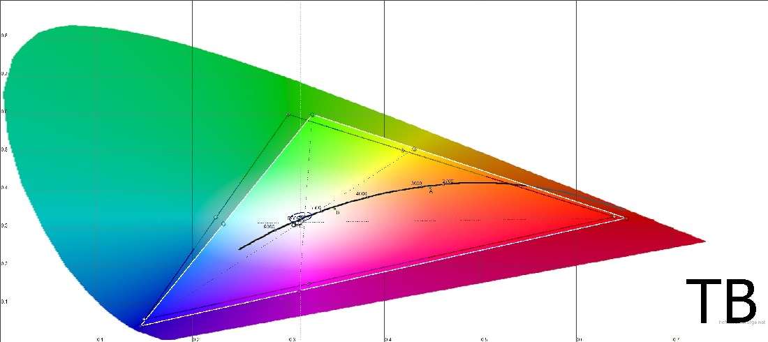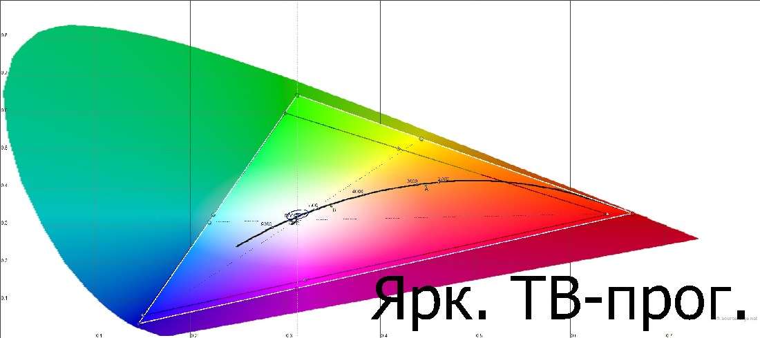 Измерения выявили такой парадокс: режим Яркий ТВ единственный, который полностью покрывает цветовой охват Rec709, превосходя его в некоторых тонах.