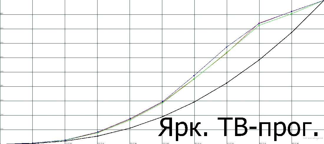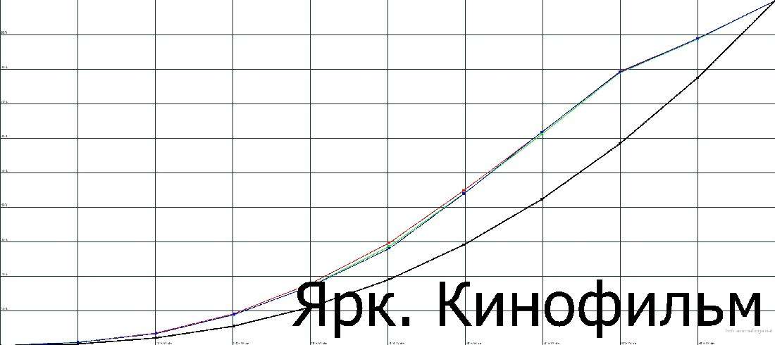 Таким образом, в режиме Кинофильм 1 есть определенные отклонения цветопередачи от идеальных значений. Однако к такой заводской настройке я бы отнесся философски: «если звезды зажигают, значит, это кому-нибудь нужно»? Значит, в жизни встречается и такой видеоряд, который удачно накладывается именно на «американские горки» гамма-кривой. В общем, режим — на любителя.