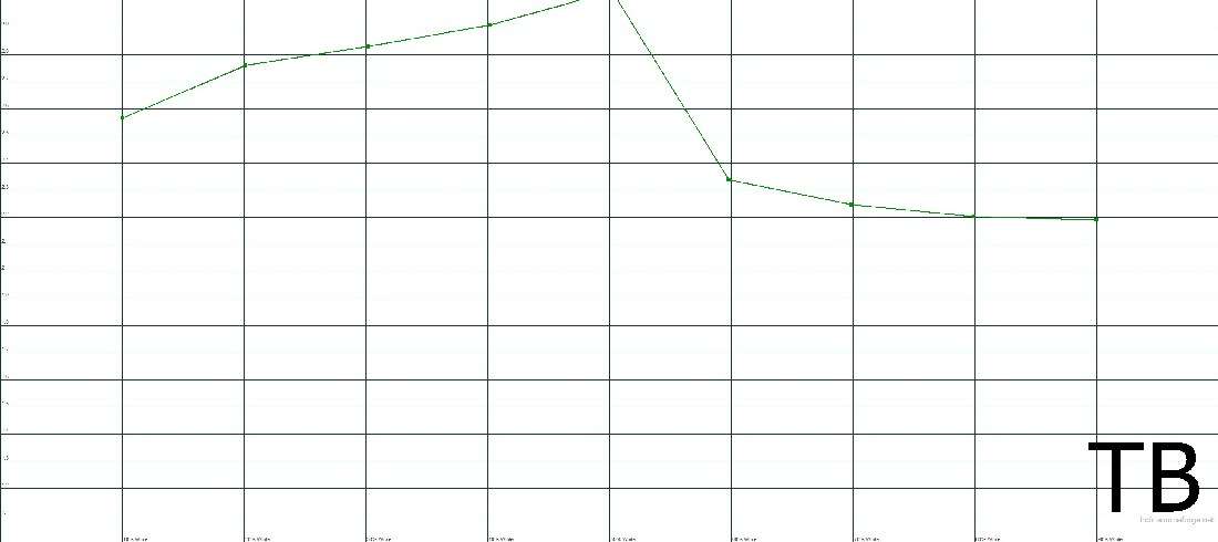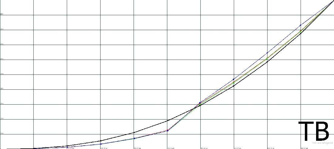 Среднее значение гаммы в этом режиме 2,44, что близко к кинотеатральному стандарту 2,4. Хотя взглянув на график значения гаммы, становится очевидным, что это все же именно среднее значение, хотя разброс между 2,3 и 2,8 не столь велик, как в предыдущем режиме.