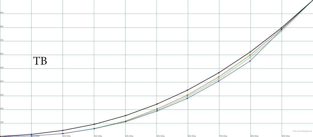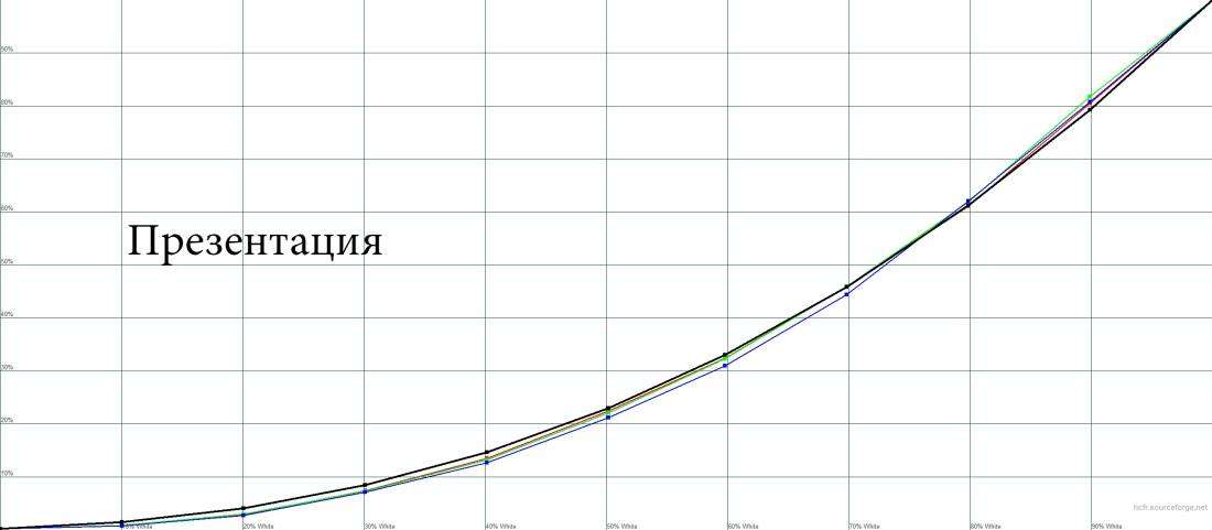 Как и во всех предыдущих случаях, режимы Фильм, ТВ и Игра мало отличаются между собой. Различия заключаются в соотношении каналов, однако в итоге общая гамма-кривая практически идентична. Режим Презентация имеет слабовыраженную форму S кривой, хорошо знакомой тем, кто занимается обработкой фотографий.