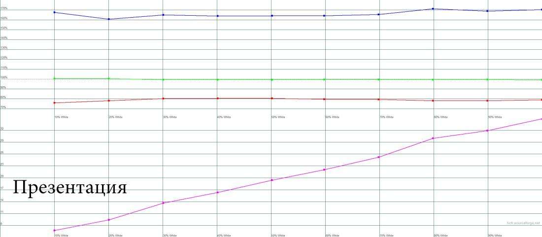 Презентация – режим обладает почти вдвое большей контрастностью по сравнению с предыдущей группой. Увеличение контраста происходит за счет сдвига точки белого. В этом режиме гамма наиболее близка к референсным 2.2.