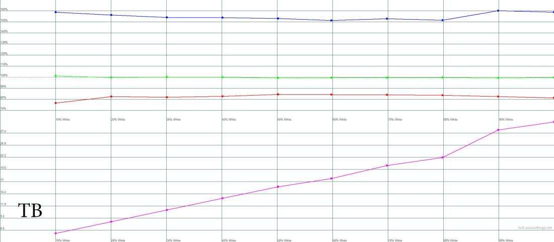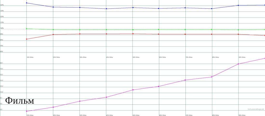 Режимы Фильм и sRGB имеют практически одинаковую цветовую температуру около 9400К, однако Фильм тяготит к незначительному розовому оттенку, а sRGB к зеленому, при общей большей стабильности цветовой температуры.