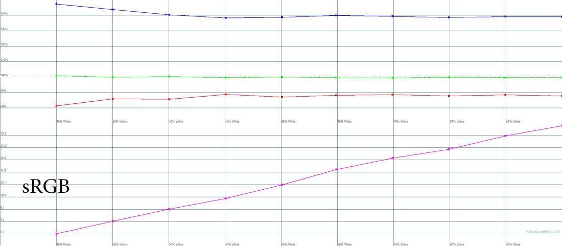 В режиме sRGB кривые каналов совпадают между собой, это очень хорошо, иногда даже важнее, чем совпадение с референсной кривой. Режим Яркий как всегда стоит особняком.