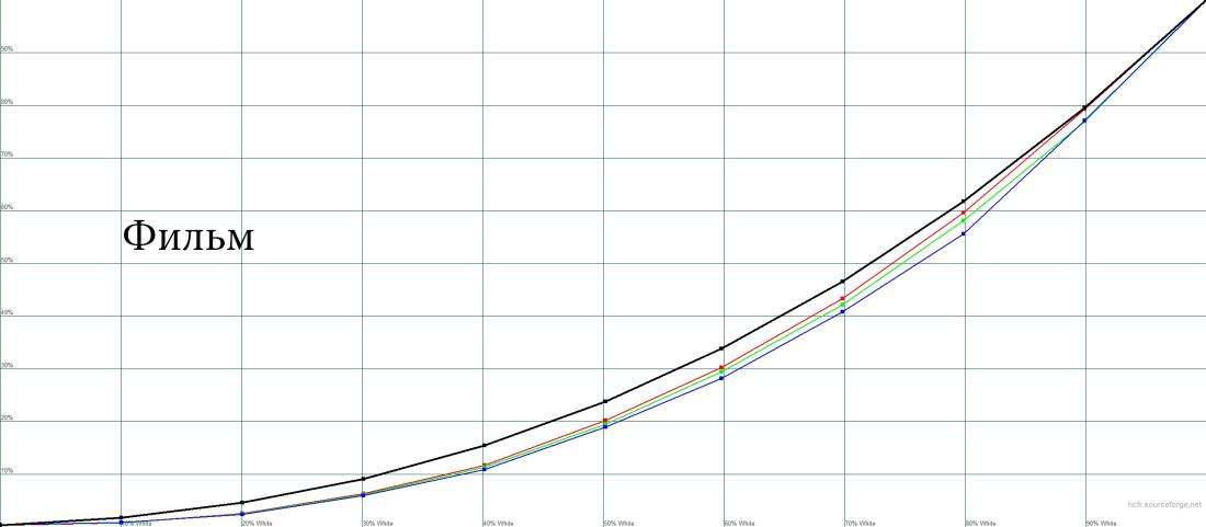 Ключ к понимаю графика простой: чем плотнее все три цветные кривые прижимаются к эталонной гамме-гривой 2.2, тем естественней и реалистичнее будут краски на экране.
