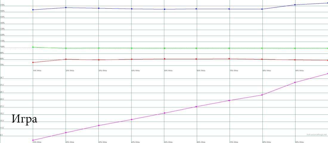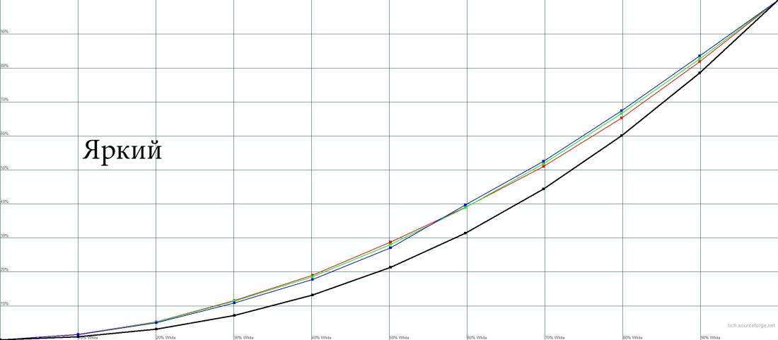 Яркий – крайне высокая яркость. Гамма в этом режиме не то, чтобы завышена, она, вероятно, намеренно задана на уровне 1,8. Действительно изображение выглядит очень ярко, но визуально это скорее похоже на соотношение G=1.0 и G=1.8. Изображение плоское, неестественное, и очень странное с точки зрения цветов, однако, об этом чуть позже.