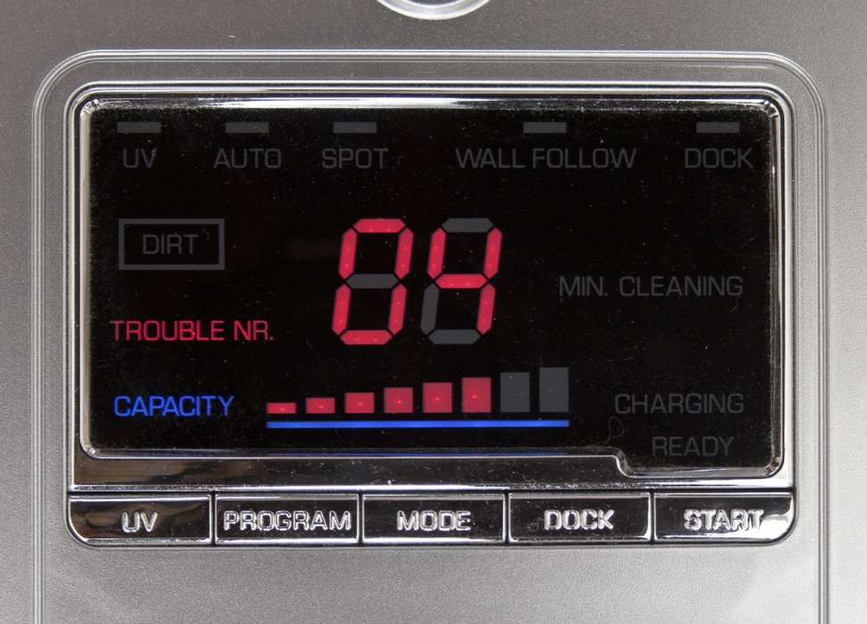 Широкоформатный ЖК-дисплей отображает уровень заряда батареи, выбранное меню, выбранную программу, время, коды ошибок. Под широкоформатным дисплеем расположены кнопки: UV (включение/выключение УФ- лампы), MODE (выход в меню автопрограмм или специальных программ), PROGRAM — активация программы уборки в выбранном меню, DOCK – поиск базы, START – старт программы.