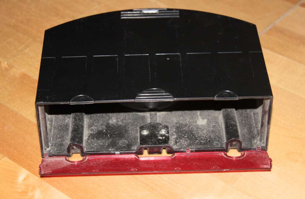 Пылесборник. Плоский пластиковый контейнер, выдвигающийся нажатием специальной клавиши. Форма и конструкция таковы, что можно удерживать его одной рукой и вытряхнуть все содержимое в ведро, не испачкав руки.