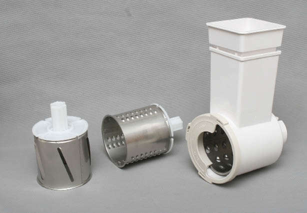 Приставка-овощерезка с тремя терками-барабанами для мелкого и крупного шинкования и нарезания ломтиками.