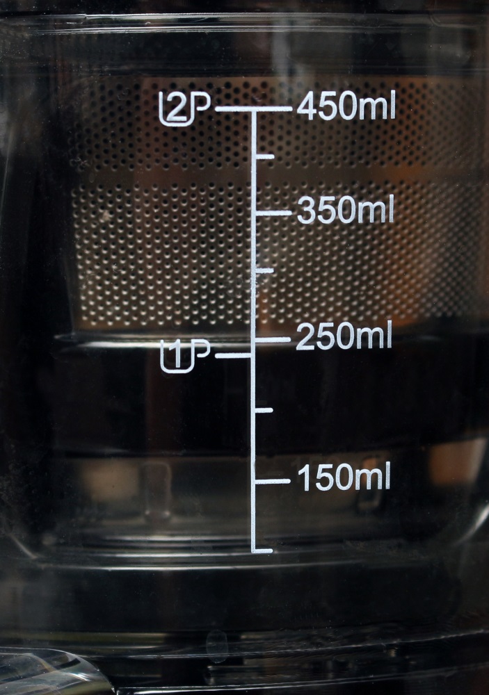 Соковыжималка средних размеров, ее нельзя назвать суперкомпактной, но при этом она небольшая, как все шнековые. Интересно, что на корпусе соковыжималки есть градуировка емкости. Мне не очень понятно, в каких случаях она может пригодиться, но вдруг кому-то из хозяек без нее сложно.