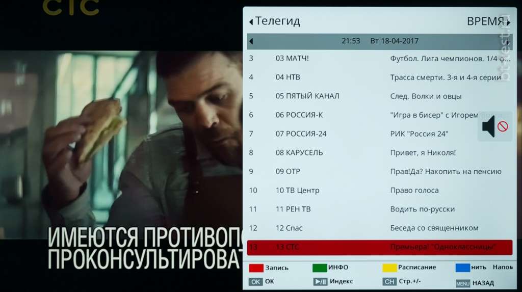 Удобно сделано и EPG – расписание программ. В первом меню выводится только список каналов и текущая программа, но по клику можно перейти на любую передачу выбранного канала и вернуться обратно. Тут же можно установить напоминание о начале интересной передачи и установить время записи.