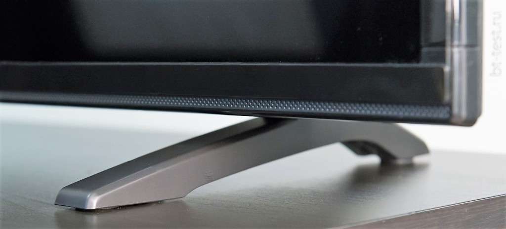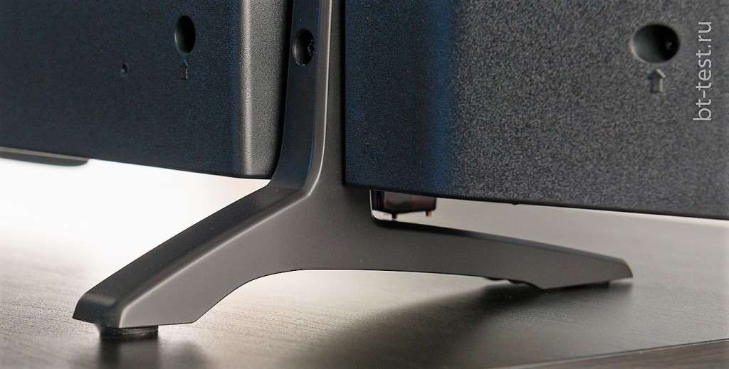 Кстати, ножки выполнены из матового пластика, они не выделяются на фоне всего корпуса, а гармонично его завершают. Размах у ножек широкий, поэтому телевизор уверенно стоит на своих двоих. Шансы опрокинуть его, даже грубо задев, минимальны.