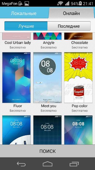 Ещё одна более красивая, нежели полезная программа — «Темы». В принципе, она не делает ничего принципиально нового, сверх того, что может Android, но делает это намного проще. Одним кликом по понравившейся теме можно изменить такие параметры, как стиль экрана блокировки, обои на рабочем столе, набор иконок системных приложений, шрифты и звуки. Изначальных на смартфоне предустановлено три темы, но, к счастью, этим дело не ограничивается: уже сейчас прямо из программы можно скачать десятки доступных тем оформления, причём все они бесплатные.
