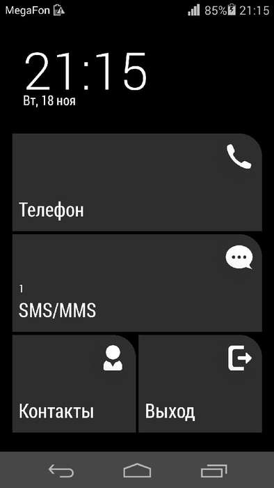 Впрочем, есть в составе EMUI и один довольно забавный режим — «простой стиль рабочего экрана». Если его выбрать (например, Настройки>«Стиль раб. экрана»> «Простой») вы переведёте свой смартфон в довольно необычный режим. Внешний вид экрана напоминает чем-то Windows Phone с её крупными кнопками-плитками. Количество приложений, доступных в таком режиме минимально, но все, которые есть, легко доступны. Этакий программный «бабушкофон».