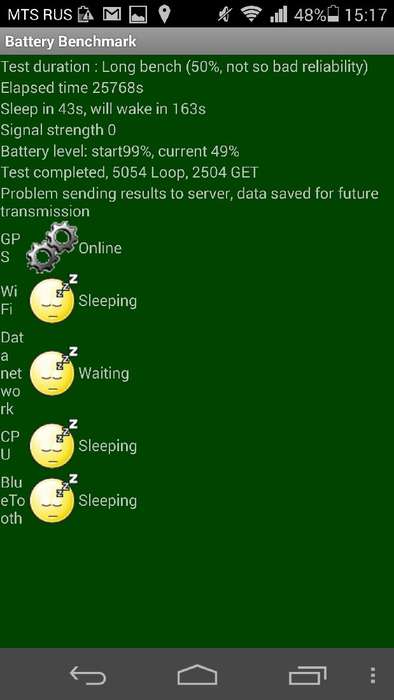 Ещё одна интересная тестовая программа — Battery Benchmark. Она также старается воспроизвести работу смартфона «как на самом деле». При этом упор делается не на мультимедиа, а на коммуникации: тестовая программа периодически запускает и останавливает Wi-Fi и Bluetooth, осуществляет сетевую активность и грузит процессор. То есть, действительно, «как в жизни». В результате долгих «издевательств» выяснилось, что в таком режиме Huawei Honor 6 способен проработать до 14 часов: батарея была посажена на 50% спустя 7 часов работы.