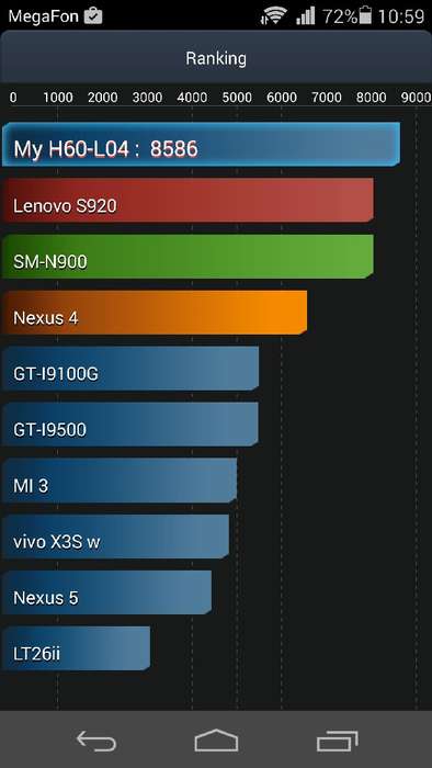 При использовании теста из Antutu Tester (v2.5) используется несколько иной подход. В этом тесте устройство последовательно нагружается то воспроизведением видео, то отображением web-контента, то отрисовкой типовой игровой сцены. Таким образом, программа имитирует работу гаджета в условиях, приближенных к реальной жизни. По результатам испытаний смартфон Huawei получил 8586 баллов и занял в рейтинге программы первое место, чем только подтвердил наши ощущения.