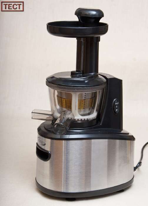 В этой соковыжималке все весьма типично для шнековых приборов. Среди особенностей можно отметить удобную кнопку включения, находящуюся на правой стороне корпуса. Реверс работает только при нажатии на него пальцем, что подчеркивает кратковременность использования этой функции. Черный пластиковый толкатель длиннее загрузочного люка, поэтому его очень удобно брать, но с непривычки сбивает при работе: хочется протолкнуть его до конца в люк.
