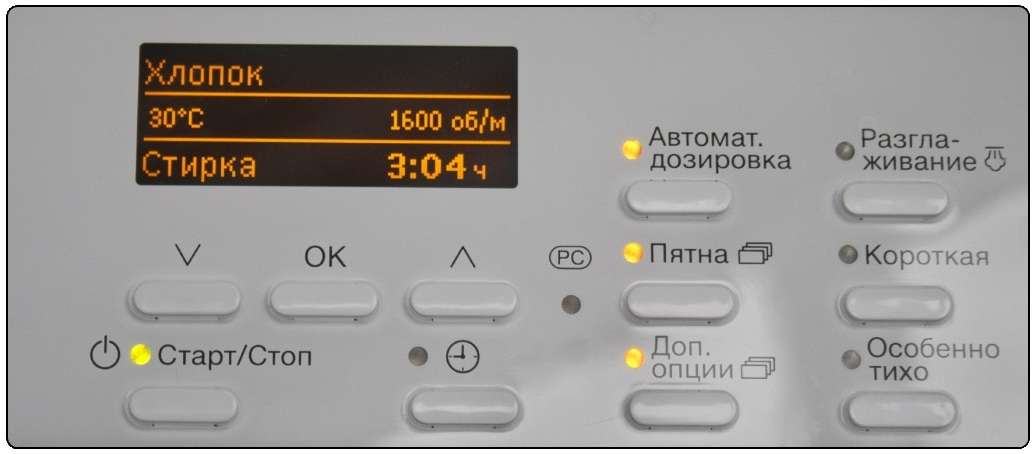 ДОПОЛНИТЕЛЬНЫЕ ВОЗМОЖНОСТИ: предварительная стирка, замачивание, короткая программа, больше воды, особенно тихо, опция «Пятна», разгладить паром, отсрочка старта 24 ч.