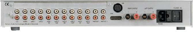На обратной панели наряду с двумя акустическими выходами можно найти 7 линейных входов, включая два магнитофонных, обеспеченных и соответствующими выходами, есть и процессорный вход и выход. Дополнительно В-110 оснащен двумя линейными выходами с предварительного каскада усиления. Два служебных разъема правее акустических клемм — порт DenLink для связи усилителя с другой аппаратурой DENSEN и вход EPS для подключения внешнего блока питания.