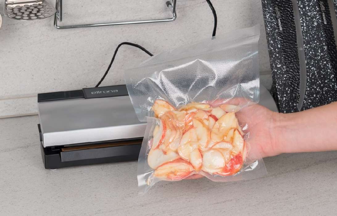 Пирог намечен на вечер вторника (обещали друзья заглянуть после работы), а яблоки я для него режу в воскресенье — возможно такое? Да, потому что яблочки, красиво нарезанные ровными ломтиками, будут завакуумированы и сохранятся в холодильнике, ведь во вторник я тоже приду с работы уставшая!