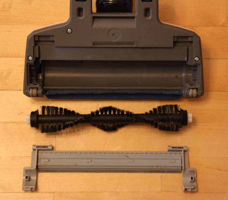 Пылесос отлично справляется с рассыпанным сухим мусором, однако есть одно НО: свою тестовую дорожку он прошел, не только всасывая мусор, но и частично раздувая и разбрасывая его — такова сила вращения турбощетки, а плотности прилегания насадки к полу не хватает, чтобы это предотвратить. В итоге, конечно, весь мусор до последней крошки был убран, но в несколько проходов. Вообще уборка этим пылесосом доставила большое удовольствие: щетка достаточно маневренна, пылесос нетяжелый, рука не устает его держать. Пол не царапается, так как щетка оснащена мягкими силиконовыми вставками и прорезиненными колесиками, однако в инструкции есть предупреждение, что надо обратить внимание на тип колесиков (видимо, бывает и по-другому).
