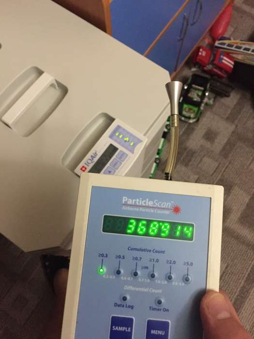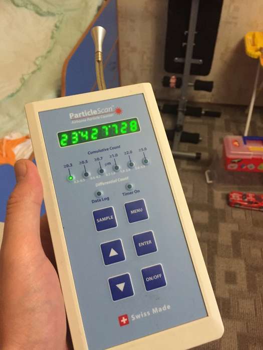 Умный прибор, которым меня снабдил представитель компании, показывает 23 427 728 частиц грязи на один кубический фут, что составляет примерно 1/35 кубического метра.