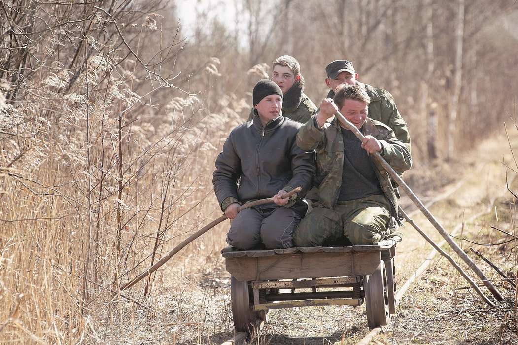 Случайная встреча на болотах. Те из жителей, кто не является счастливым обладателем моторной дрезины, путешествуют по заброшенной узкоколейке, по местному выражению, «на колах». Виталий и его друзья двигались на дальнюю речку Пылку ловить рыбу и любезно пригласили меня с собой. Объектив Sony 70—400, фокусное расстояние 330 мм, ISO 200, f7,1, 1/200 c.