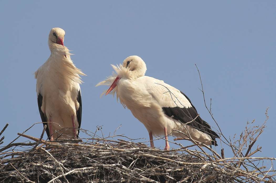 Белые аисты на гнезде. Объектив Sony 300/2,8G в паре с телеконвертором 1,4х. Общее фокусное расстояние 420 мм. Сохраняются все функции камеры, включая автофокусировку. Съемка с рук в ясную погоду, для стабилизации дрожания тяжелого объектива применялась система Super SteadyShot. ISO 100, 1/320 с, f10. При установке телеконвертора максимально возможная диафрагма уменьшается до 4, а чтобы компенсировать влияние телеконвертора на качество изображения, диафрагма была уменьшена до 10.