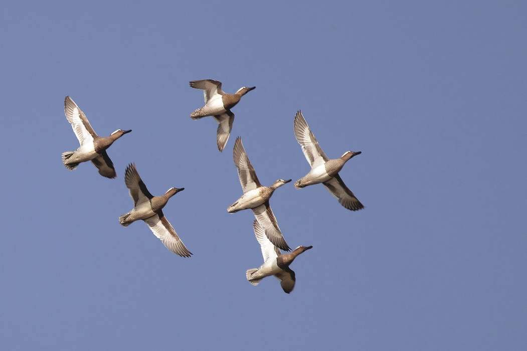 Стая северных уток — свиязей продолжает свой путь в Арктику. Демонстрация возможностей следящей автофокусировки. Объектив схватил стаю птиц и вел в режиме следящего фокуса до того момента, когда они скрылись на горизонте. Объектив Sony 70—400, фокусное расстояние 400 мм, ISO 100, полностью открытая диафрагма, выкадровка примерно 1/10 части изображения демонстрирует высокое качество матрицы, 1/800 с, съемка с рук, следящий фокус.