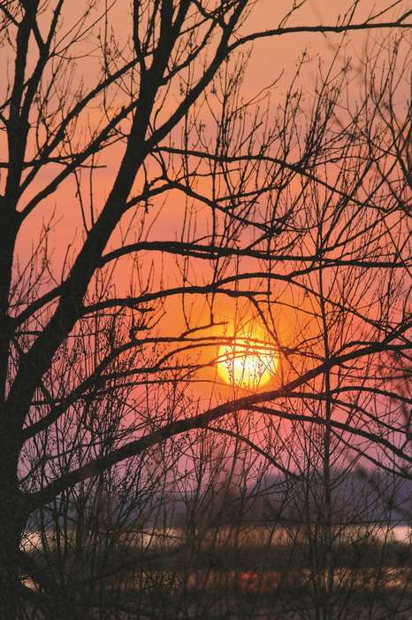 Озеро Полисто. Памятник природы. Для того, чтобы проработать небо, но не потерять рисунок ветвей на фоне солнечного диска и на переднем плане, была включена функция улучшения динамического диапазона с уровнем воздействия + 4. Объектив Sony 70—400, ISO 400, f8, 1/1600 c. Чтобы компенсировать воздействие солнца на автоматику камеры, применялась коррекция экспозиции +0,7. Визуальный контроль