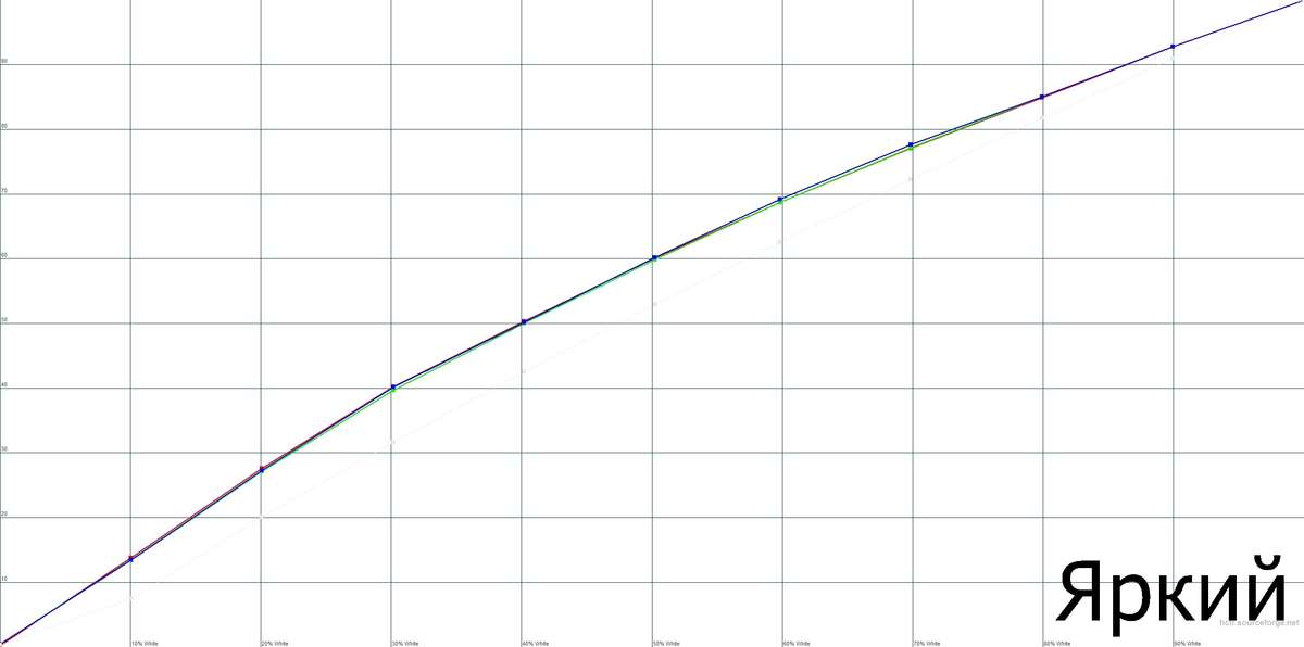 Яркий – поскольку этот режим специально настроендля работы с внешним освещением, то в нем используется более светлая гамма – 1.83, позволяющая сохранить читаемость контента при дневном свете. Vivitek отказался от использования S гамма-кривых и в этом профиле. Тем не менее, режим Яркий свою главную функцию выполняет неплохо – даже при включенном свете детали в темных участках изображения вполне различимы. Этот режим имеет теплую цветовую температуру, равную 5800К,с небольшими посторонними зеленоватыми оттенками. Но на экране подобные коллизии особо выпячиваться не будут, поскольку цветопередача в условиях дневной подсветки - не самый главный параметр.