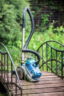 При уборке он достаточно прытко едет на своих больших колесах, но при резких маневрах может завалиться набок. Правда, это никак не сказывается на его работе. Если придерживать шланг, то агрегат крепче «стоит на ногах» и «держится рядом», как послушный домашний питомец. Очень удобно, что насадки хранятся на трубке устройства: они всегда под рукой и не теряются. Отмечу также тот факт, что пылесос легко проникает в узкие пространства, например под диван.