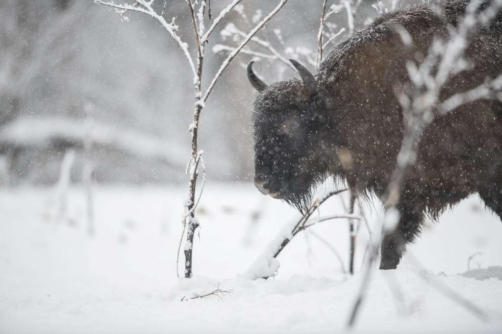 Зубры периодически перемещаются из леса на поляну, а это очень сильно влияет на освещенность сцены. Также освещенность в тот день постоянно менялась из-за снегопада. В таких ситуациях функцияAutoISOочень сильно упрощает жизнь фотографа